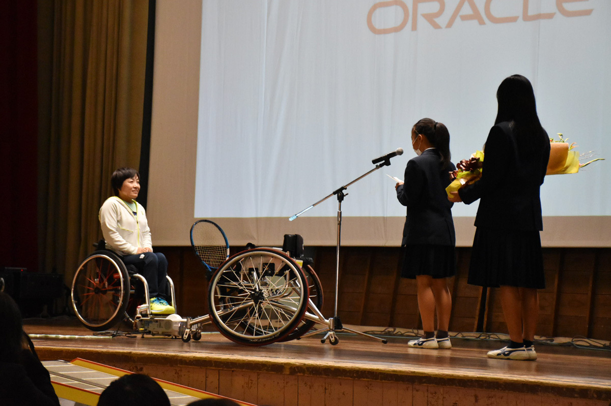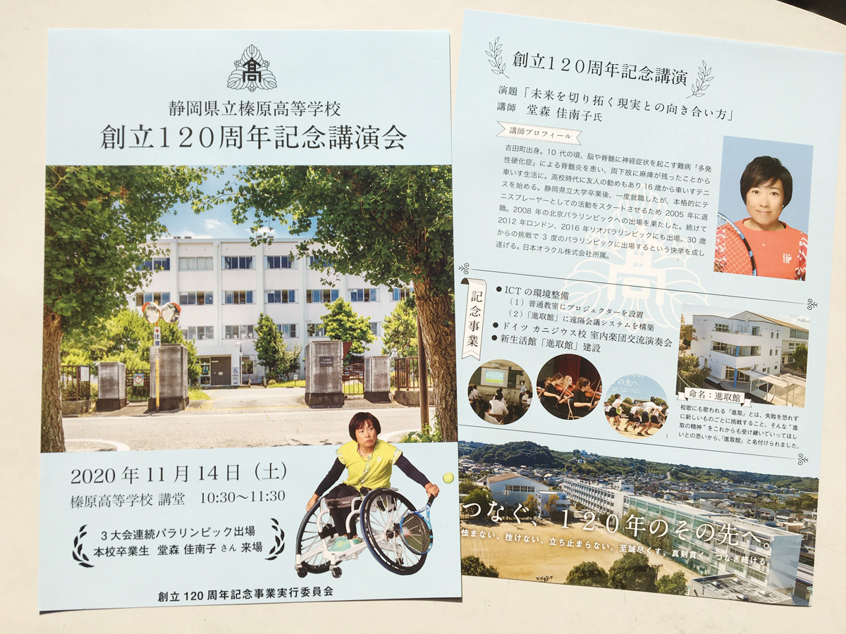 講師としてお迎えしたのは、吉田町出身で榛原高校の卒業生である、車いすテニスプレイヤーの堂森佳南子さん。「未来を切り拓く現実との向き合い方」という演題での講演を拝聴しました。