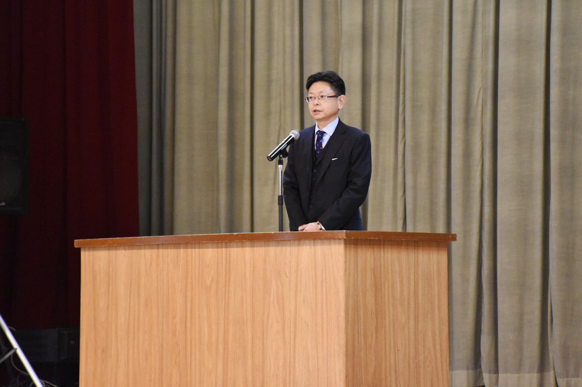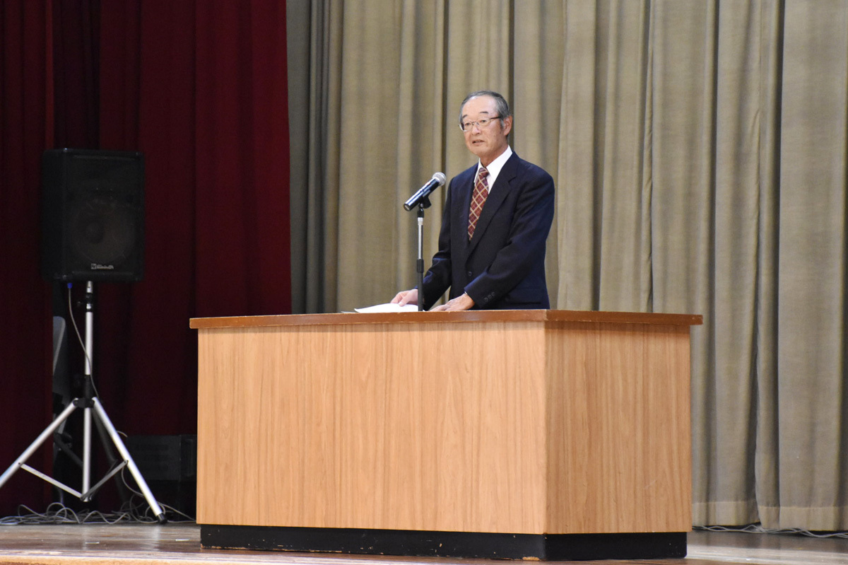 本来であれば、多くの来賓を迎え、盛大に開催される予定でしたが、コロナの影響もあり、記念式典を見合わせ、講演会の形に。感染予防対策を実施した上で、生徒、教職員、主催者のみでの開催となりました。