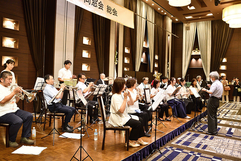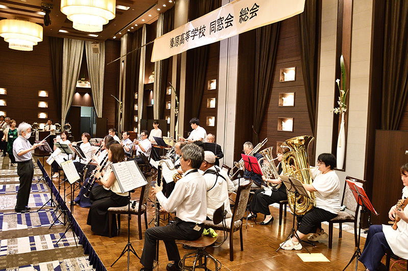 総会に引き続き行われた懇親会では、和やかな雰囲気の中、旧交を温めました。懐かしい顔ぶれに、当時の思い出がいくつもよみがえってきたのではないでしょうか。終盤には、榛原高校吹奏楽部OB・OGの方が所属する「吉田ブラス音楽団」さん(ホームページ、インスタ)に演奏を披露していただきました。幅広い年代に向けて演奏して下さり、音楽に合わせてダンスをする参加者もいらっしゃいました。ラストは生の演奏での校歌合唱。久しぶりに歌う方も多かったのではと思いますが、懐かしさと母校への気持ちがこもった歌声は、会場を1つにしてくれました。