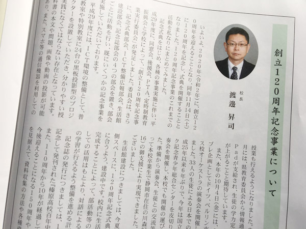 いよいよ来年2020年には、榛原高校は創立120周年を迎えます。「榛原高校創立120周年記念事業実行委員会」が立ち上げられ、多様な事業が計画されています。簡単ではございますが誌面にてご紹介させていただいておりますので、それぞれの場所、お立場で、母校や故郷への思いを新たにしていただければ幸いです。
